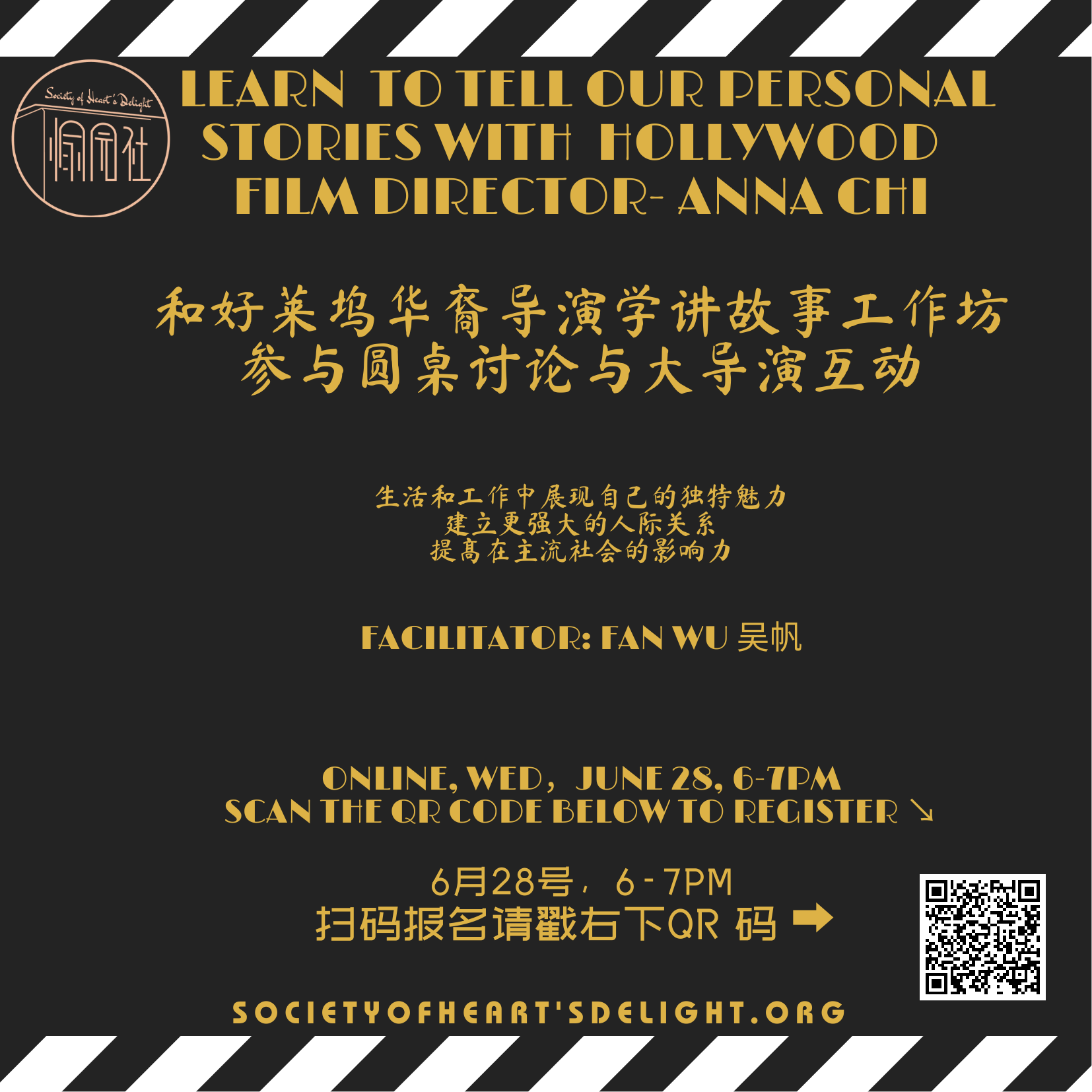 故事具有连接人心的力量。在这个线上工作坊中,Anna Chi导演将分享她在讲故事方面的丰富经验和独到见解,包括如何通过故事的力量来引发情感共鸣和激发聆听者的兴趣。她将深入探讨包括故事结构、情节发展、角色塑造等的讲故事的核心要素。学会如何讲故事,不但可以释放心灵,了解自我,而且可以帮助母语不是英文的你与家人、朋友和同事建立更深入的人际关系。在工作上能改善和促进多方位的合作关系,提升个人影响力,为升职加薪和职业发展助力!让我们一起跟着Anna Chi导演来学习和探讨如何讲故事吧!